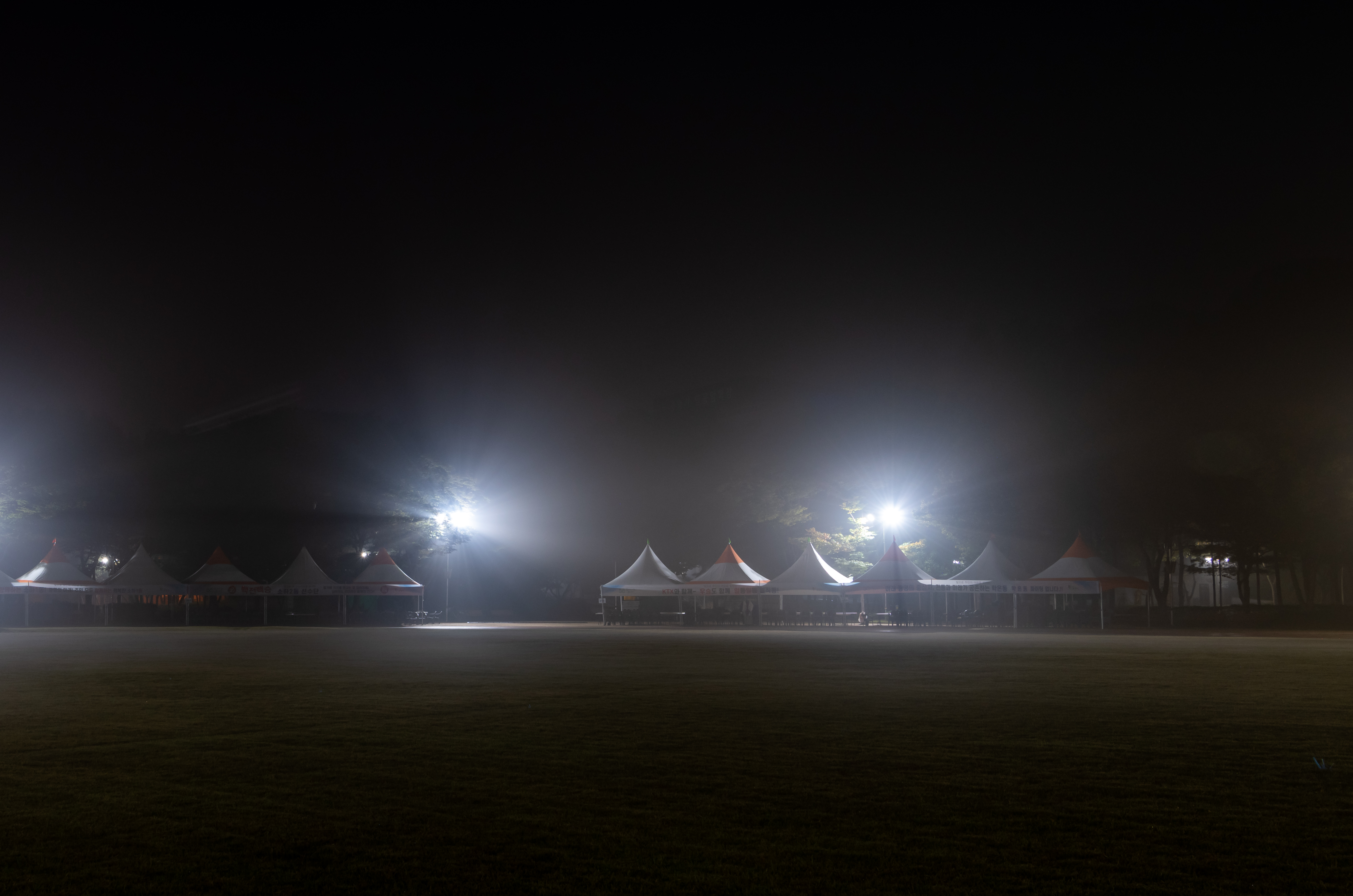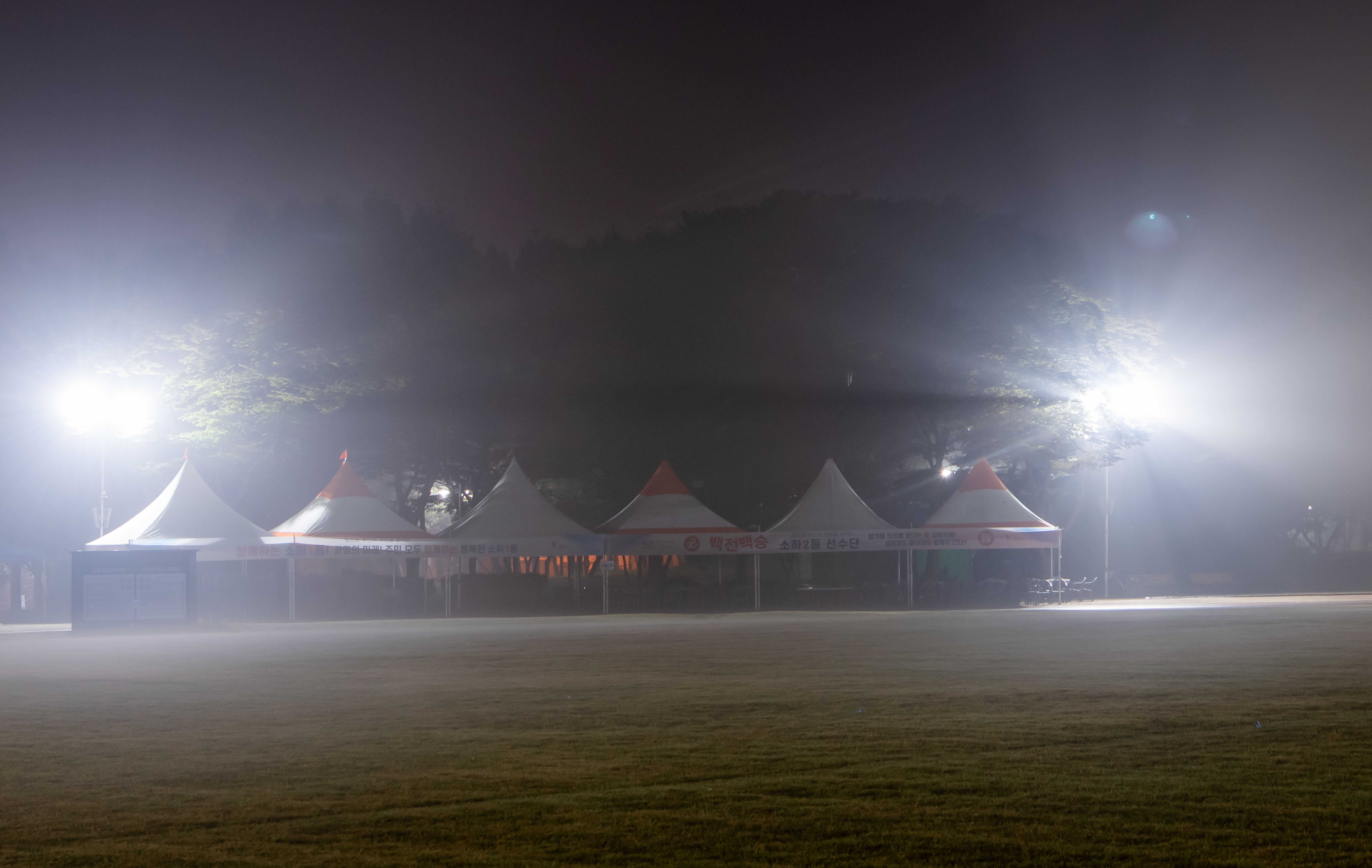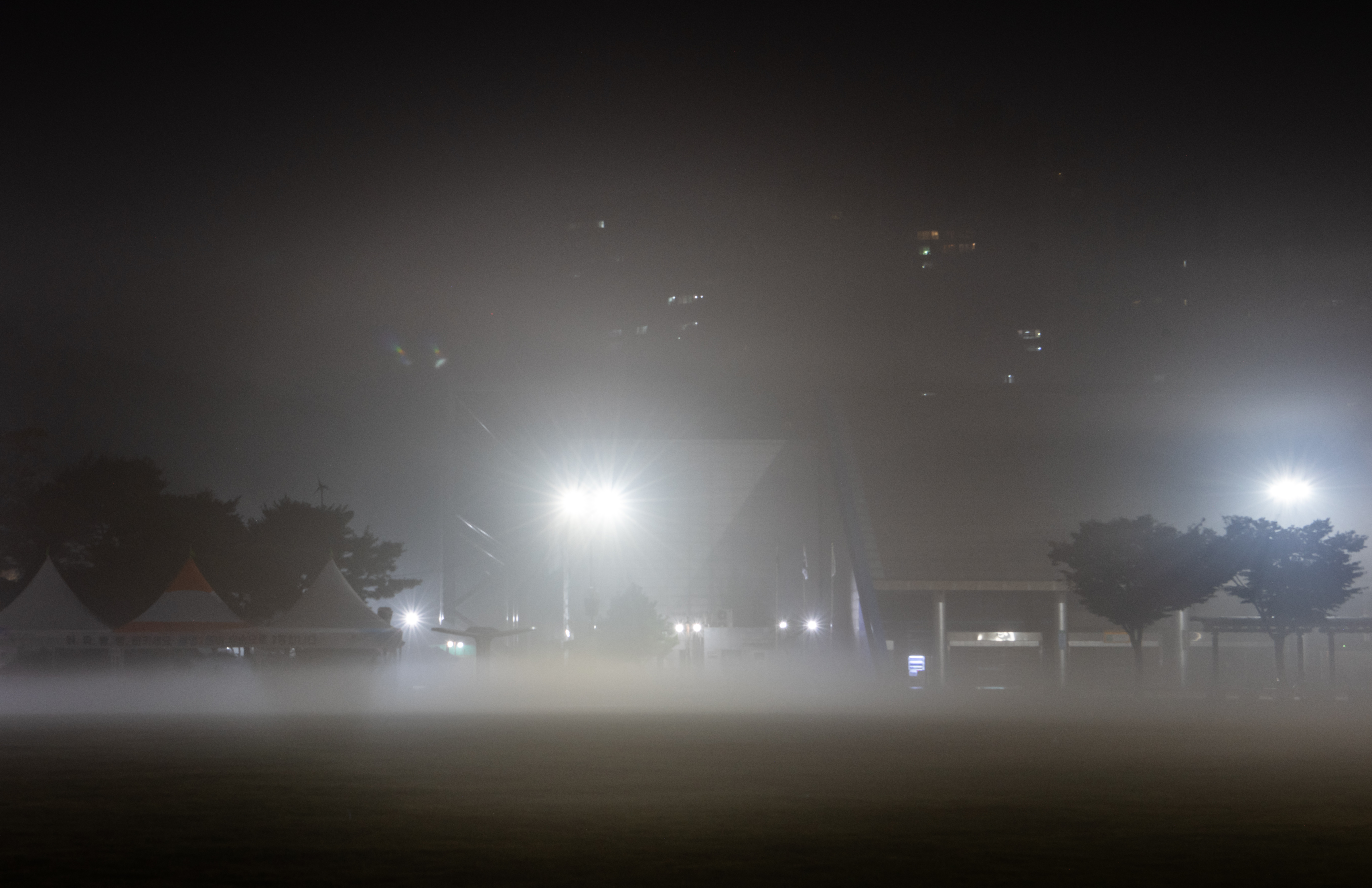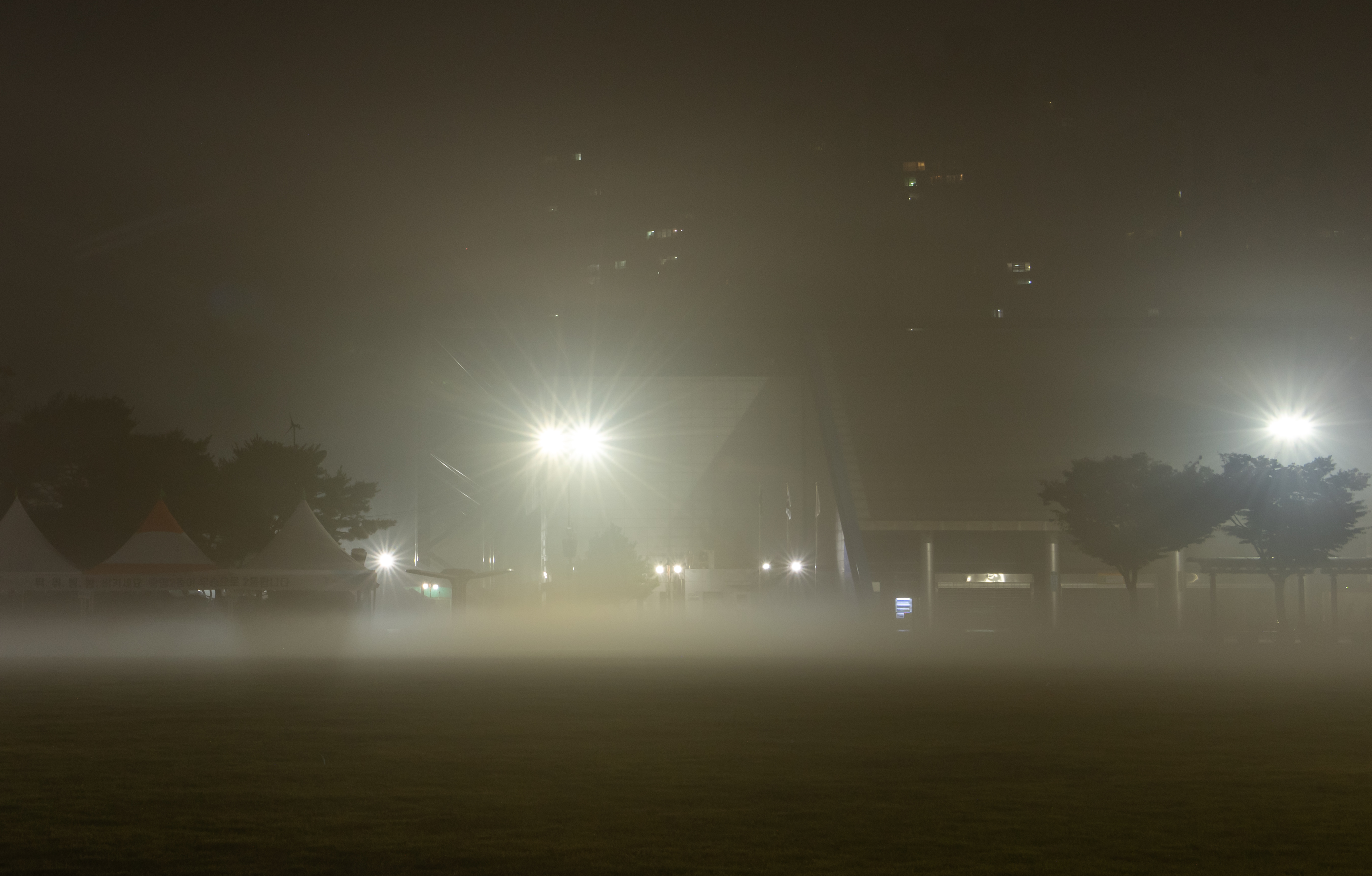 10월 1일 광명시청 개청 41주년 행사 때문에 쳐 놓은 천막과 안개가 어울러져서 참으로 멋진 그림을 만들었기 때문이다. 기대를 하고 막상 당일 새벽에 카메라를 챙겨서 나가보니 천막에는 글씨를 써 더덕더덕 붙여 놓았고 안개도 전날 같지가 않았다. 여명이 있을 때 까지 기다리겨고 하였으나 아무리 보아도 글씨 때문에 그림이 될 거 같지가 않아서 집에 카메라를 갖다 놓고 다시 아침 산행을 나갔다.
