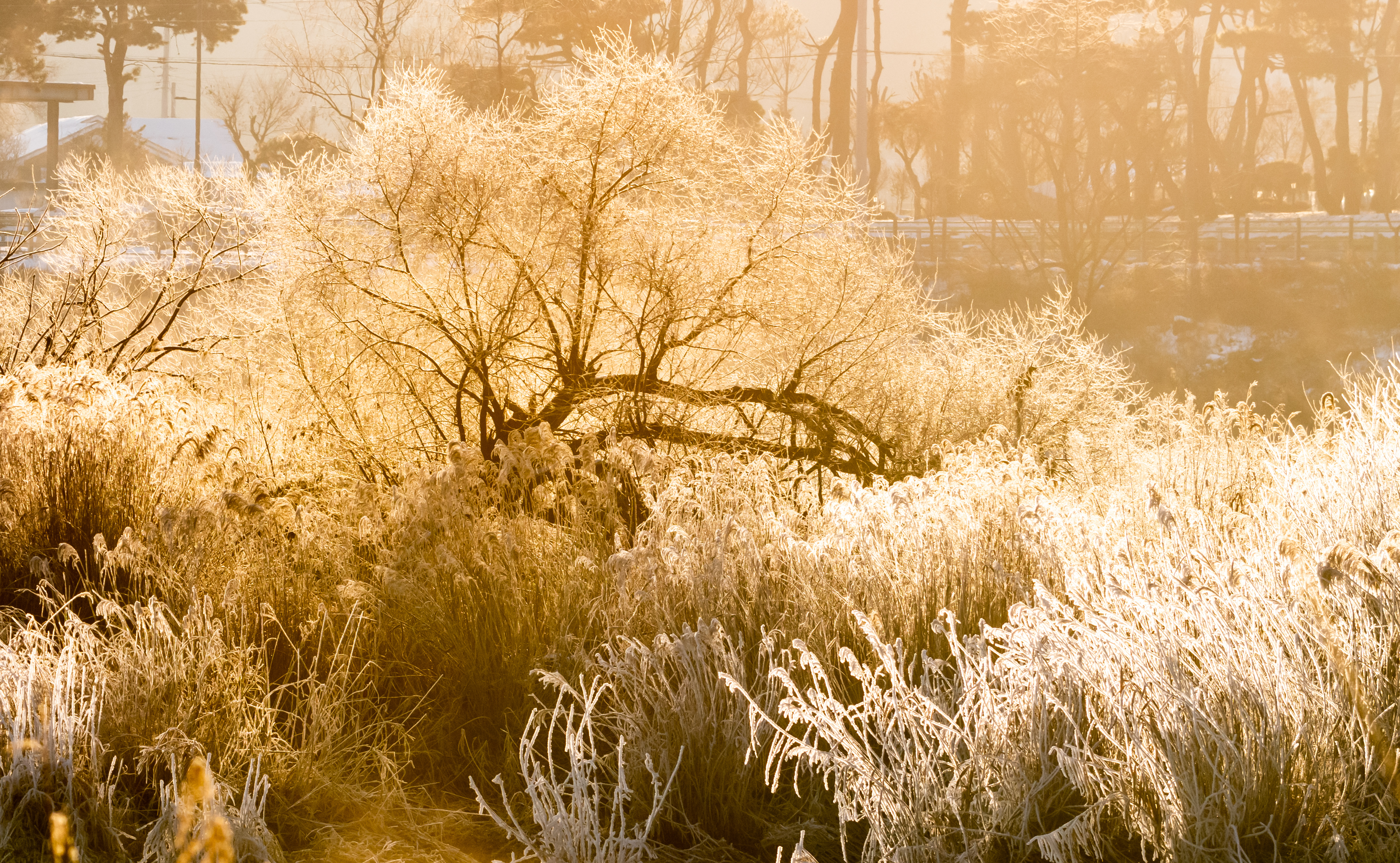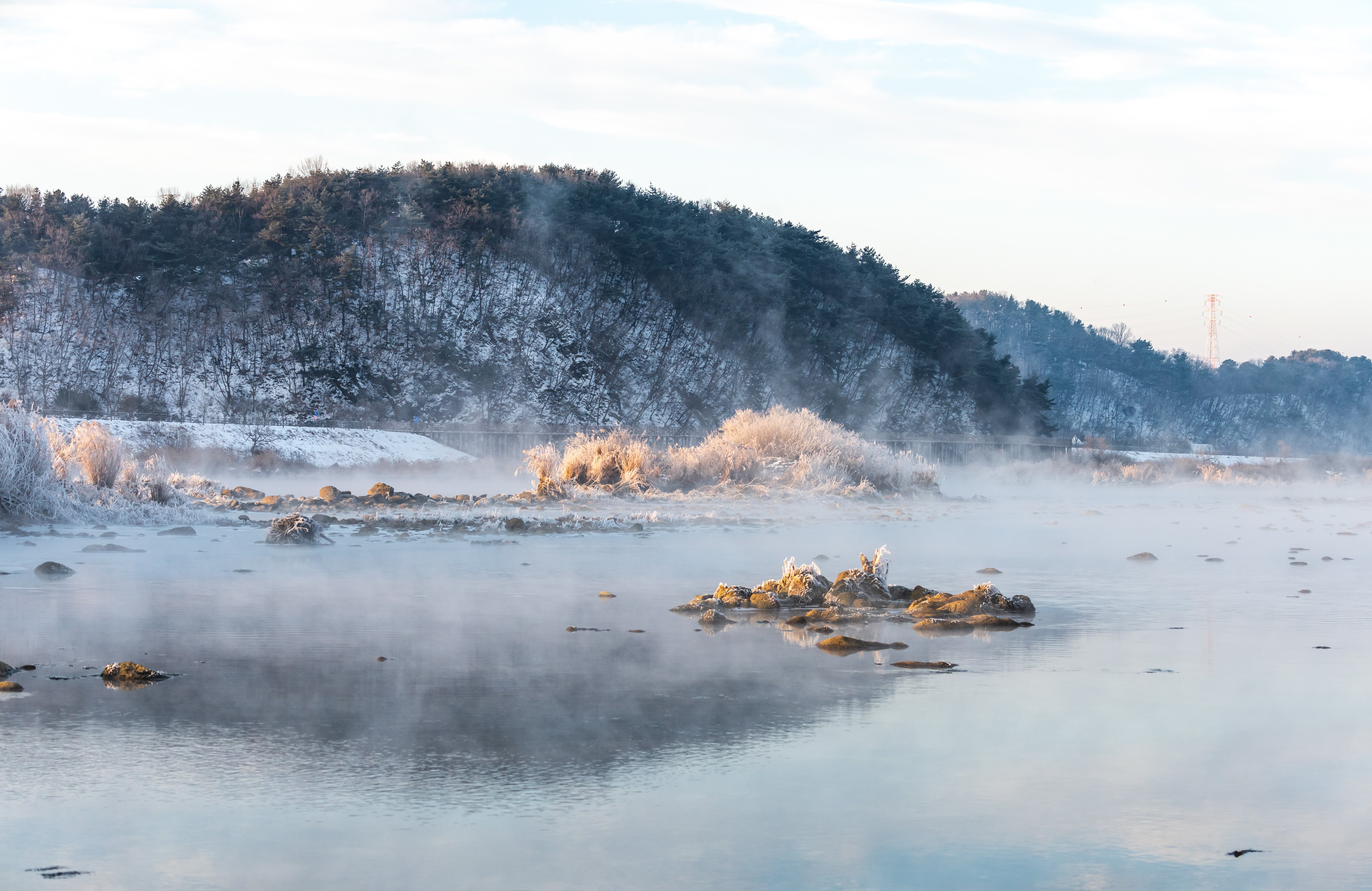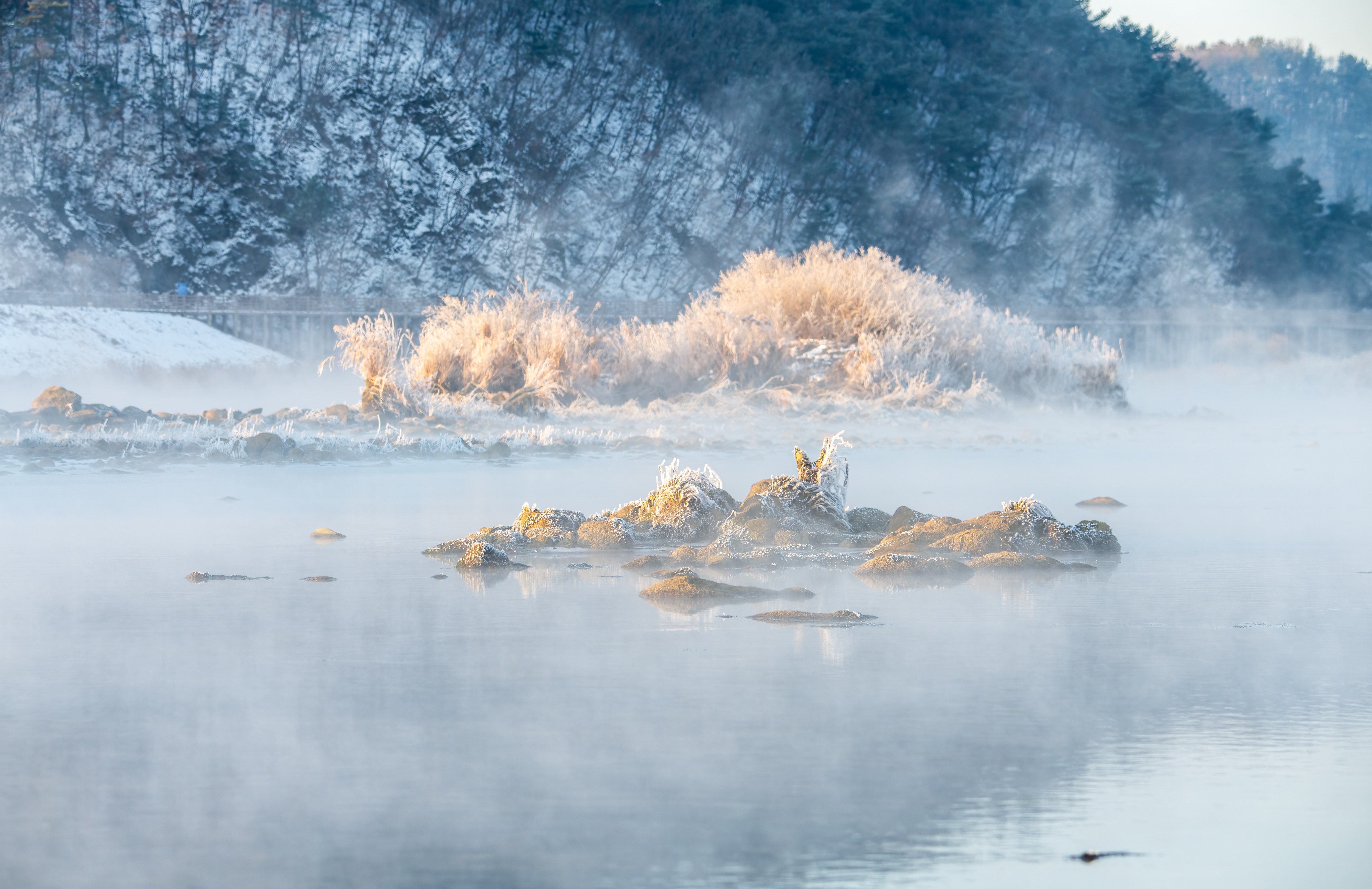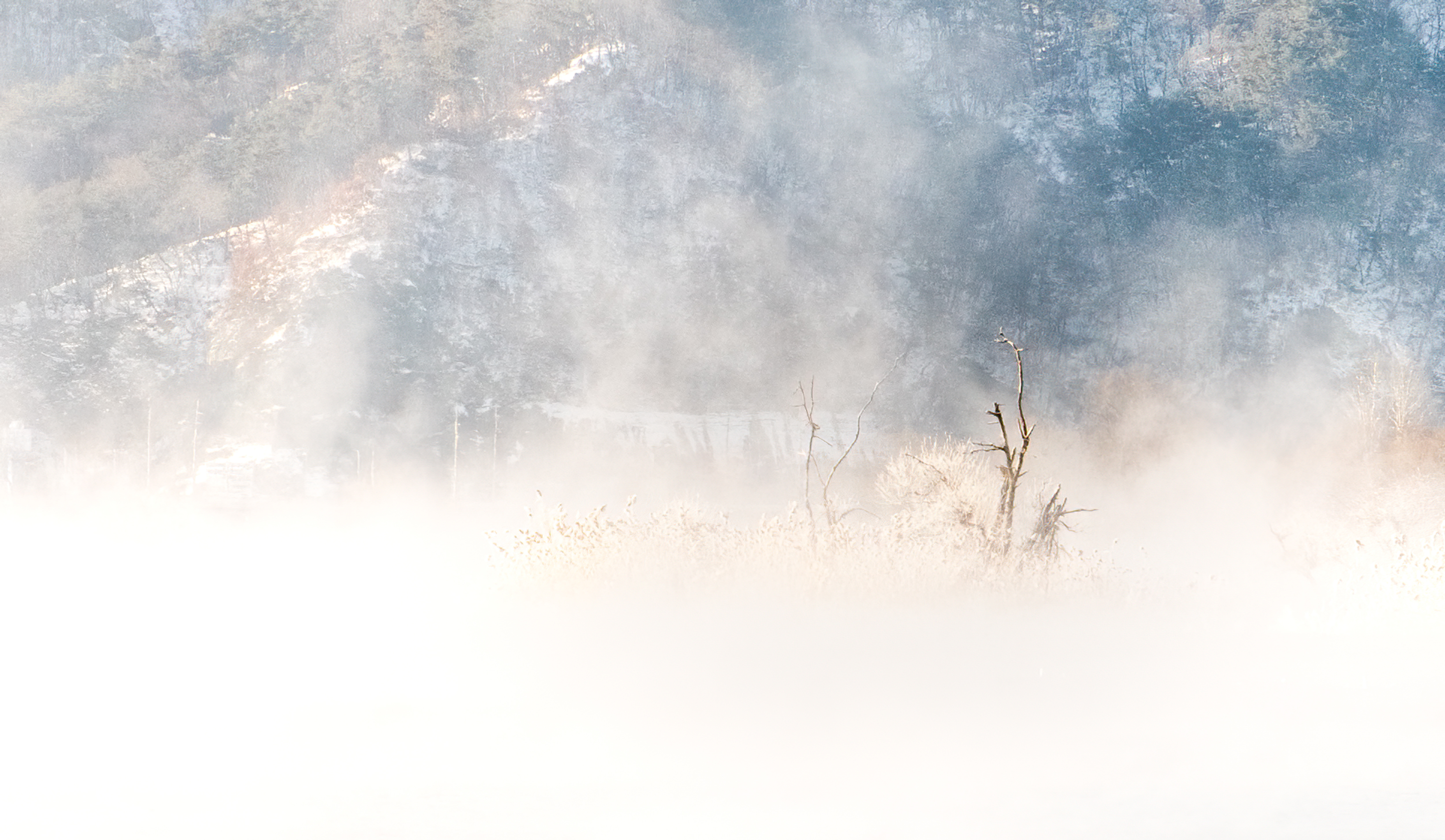 막상 물안개가 피어나면서 상고대가 열리기 시작을 하면서 만들어지는 풍경은 옛날 보았던 그 풍경과 너무나 거리가 있어서 실망을 하였다. 아마 강 주변을 정비하면서 나무들을 잘라내었거나 둑방길에 팬스를 설치한 것이 예전의 풍경과는 많이 다른 풍경을 만드는 것이 아닌가 생각을 해 본다.