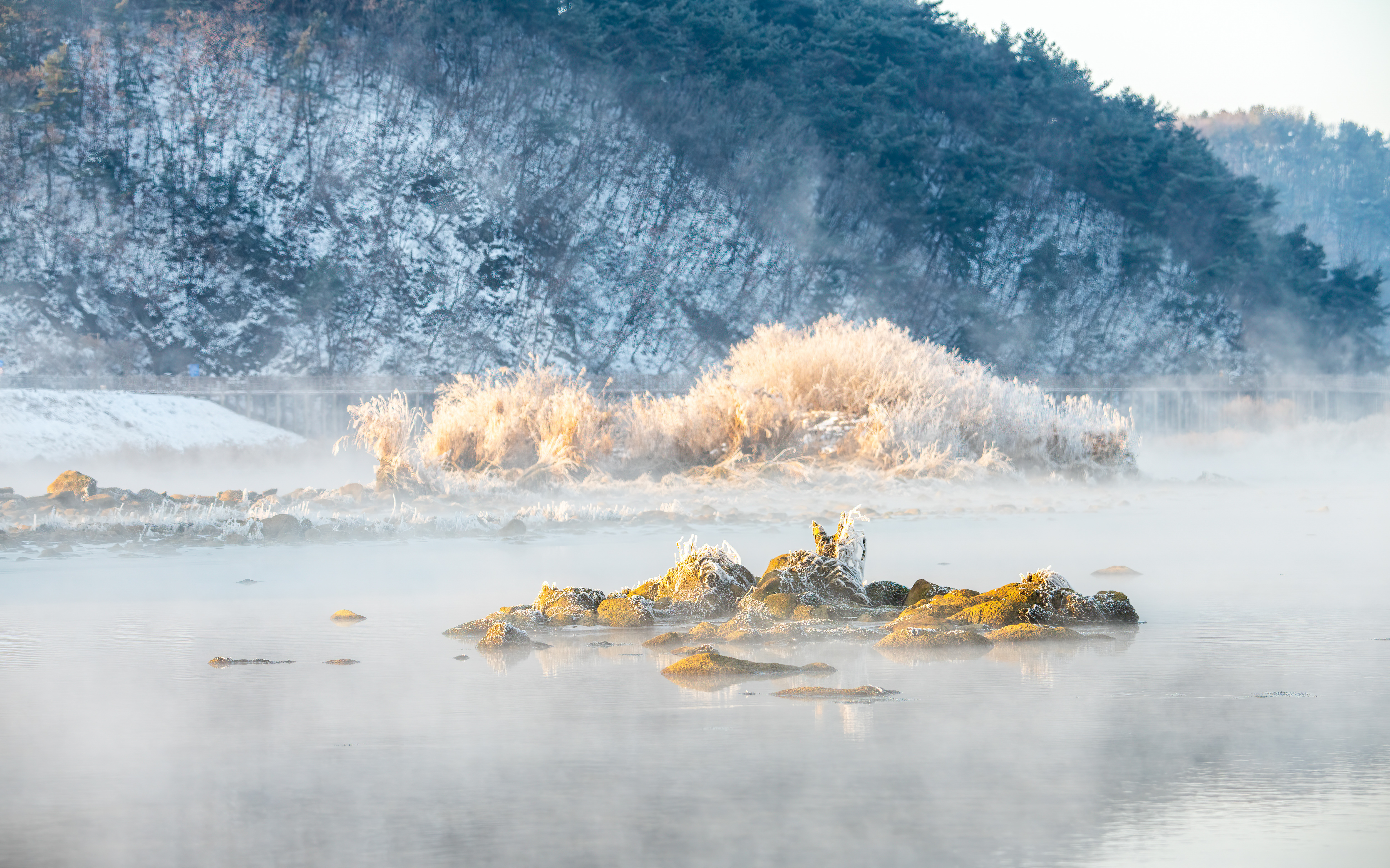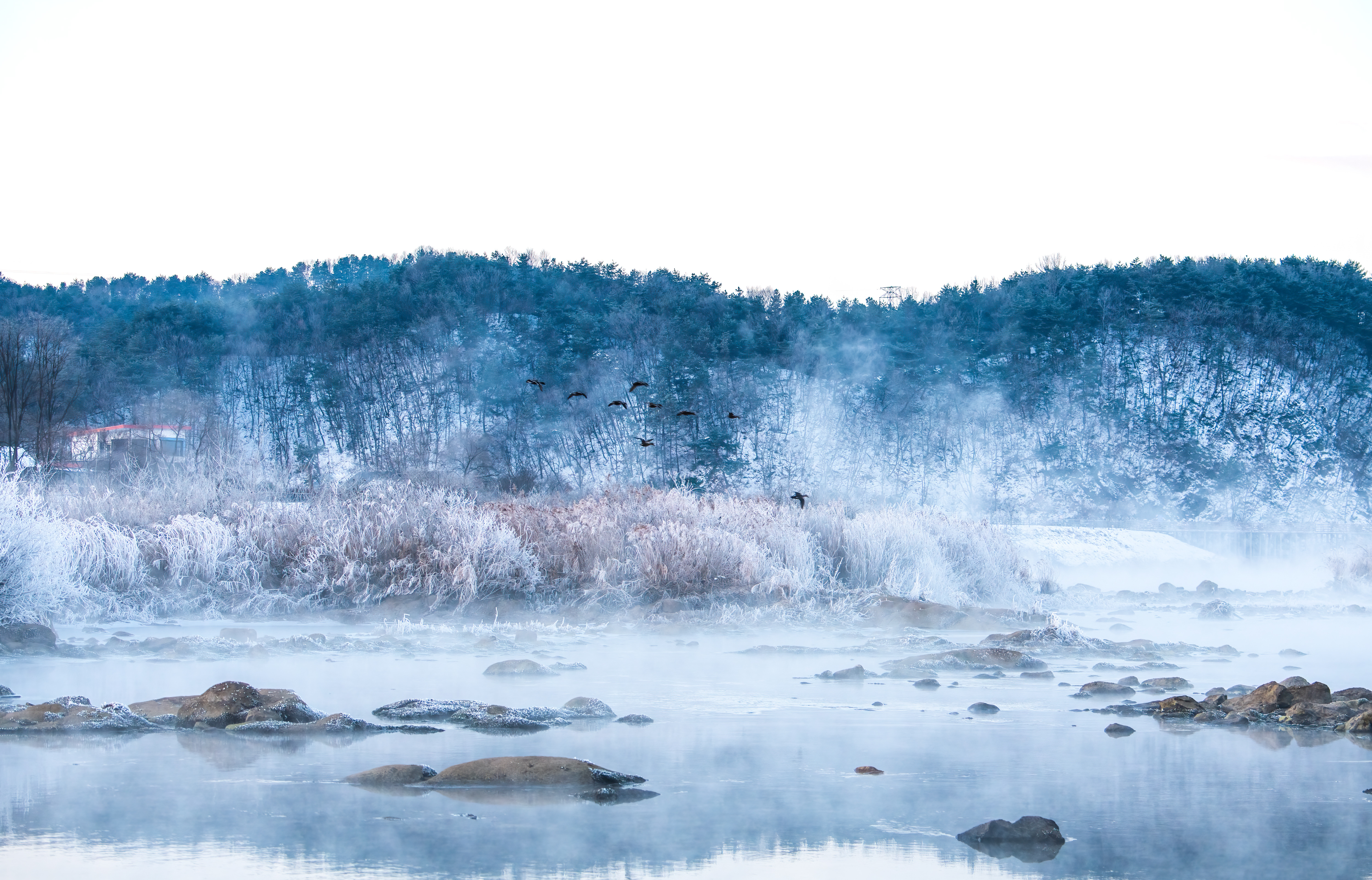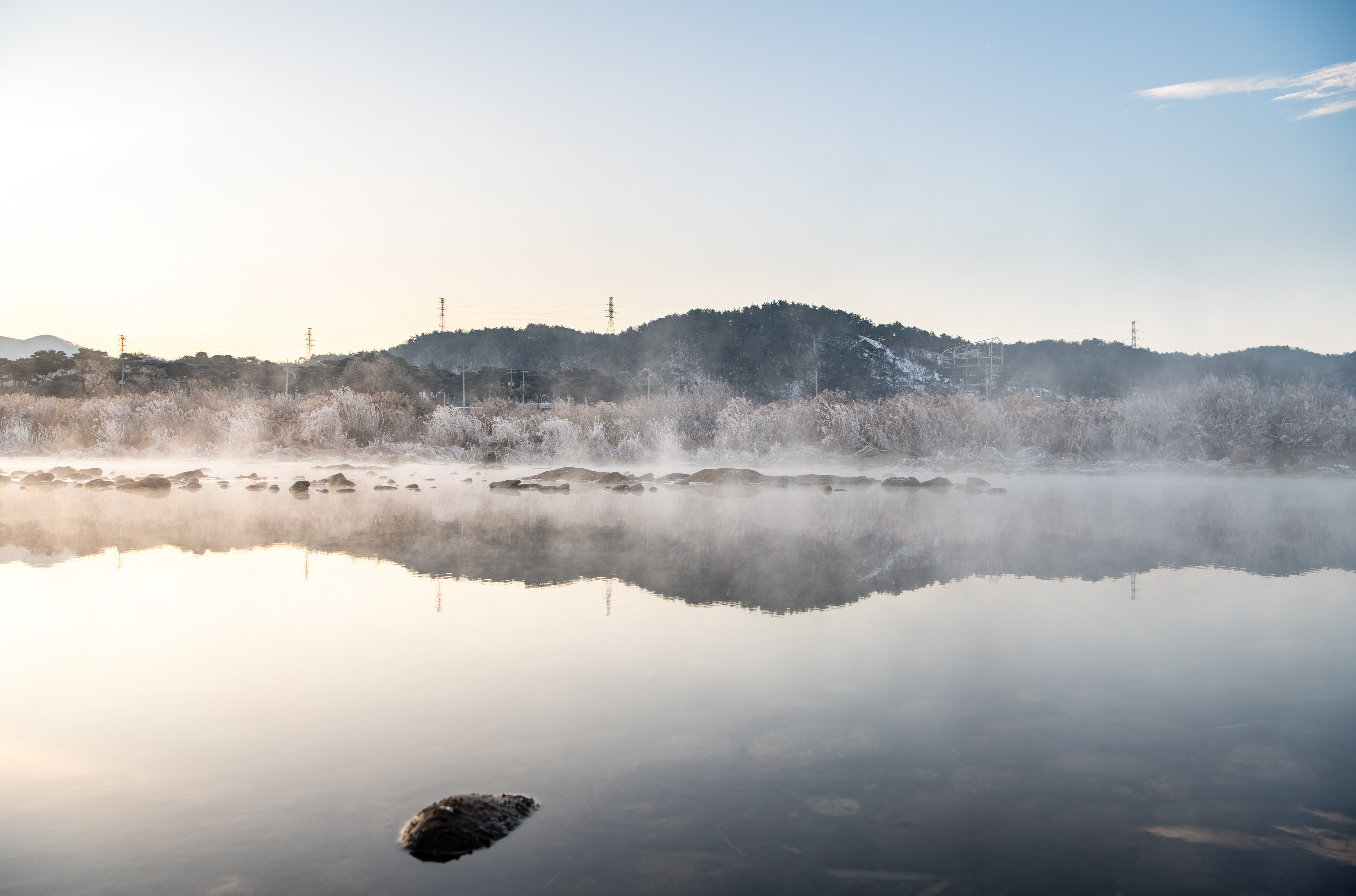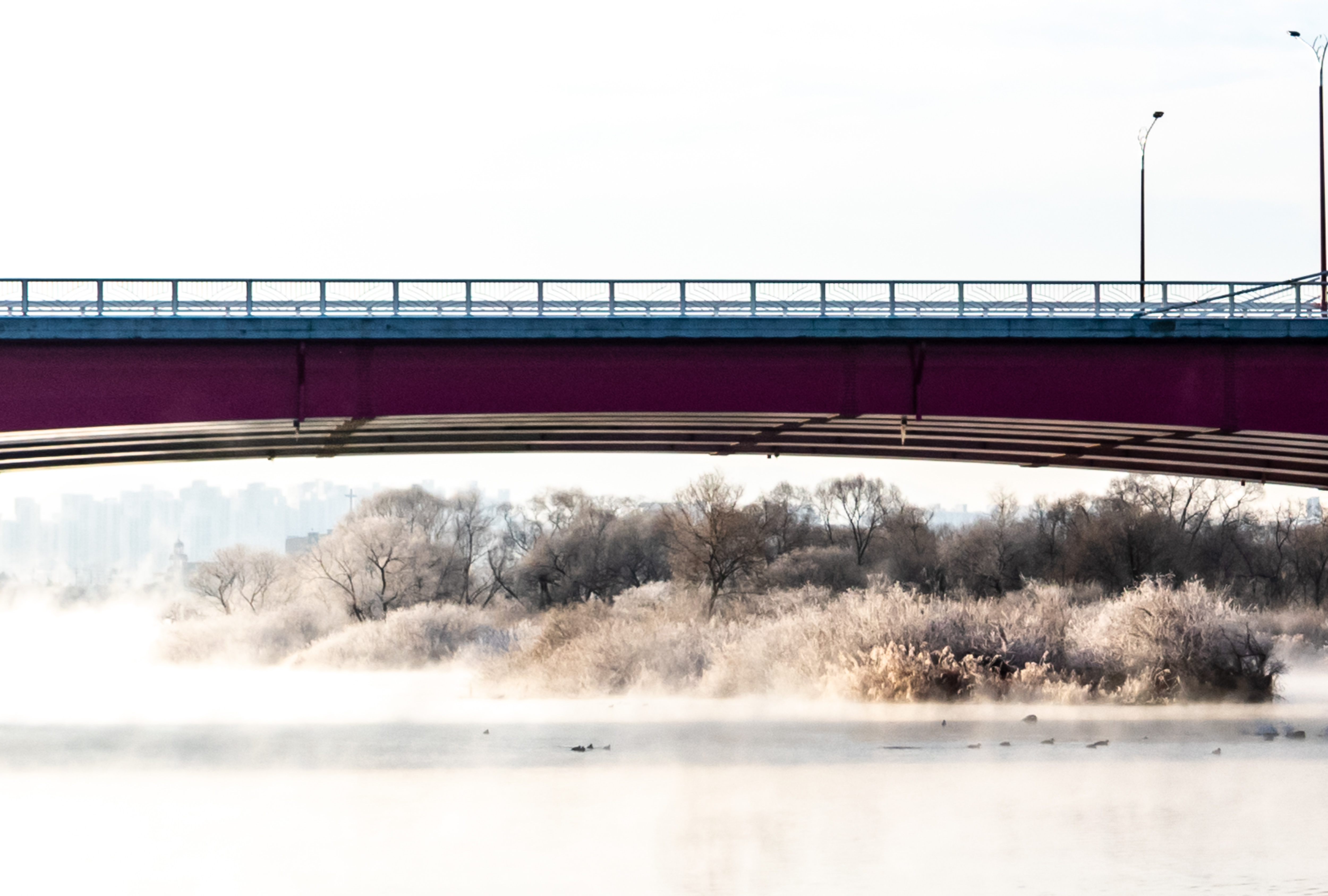 막상 물안개가 피어나면서 상고대가 열리기 시작을 하면서 만들어지는 풍경은 옛날 보았던 그 풍경과 너무나 거리가 있어서 실망을 하였다. 아마 강 주변을 정비하면서 나무들을 잘라내었거나 둑방길에 팬스를 설치한 것이 예전의 풍경과는 많이 다른 풍경을 만드는 것이 아닌가 생각을 해 본다.
